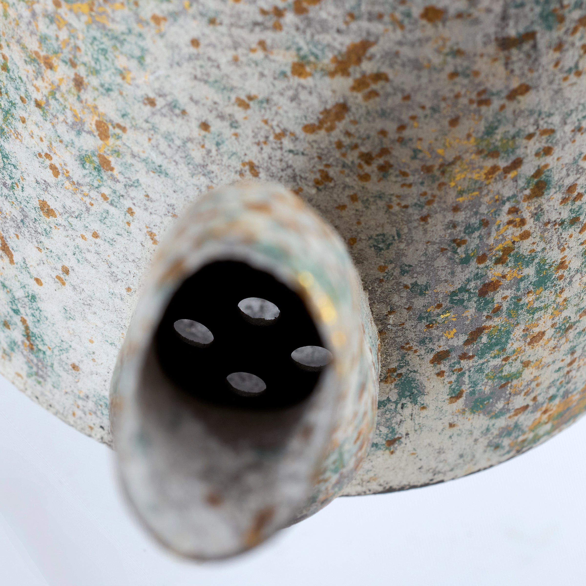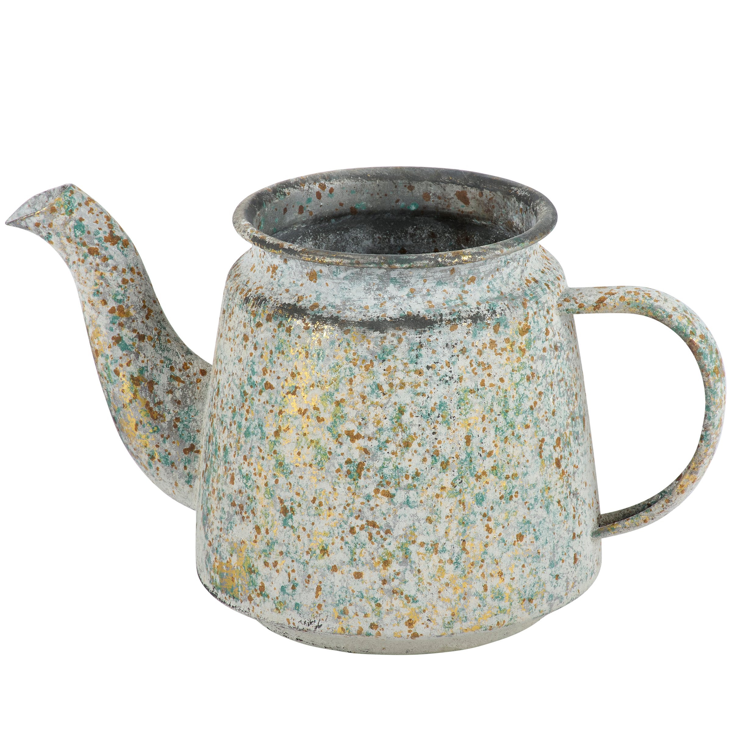 A metal watering can from our Cottage Charm Collection displaying a rustic speckled finish. Rustic watering can features a hole on the top to place greenery or décor. Greenery pictured not included. Our Rustic Speckled watering can is a rustic plant accessory that coordinates well with cottage decor.