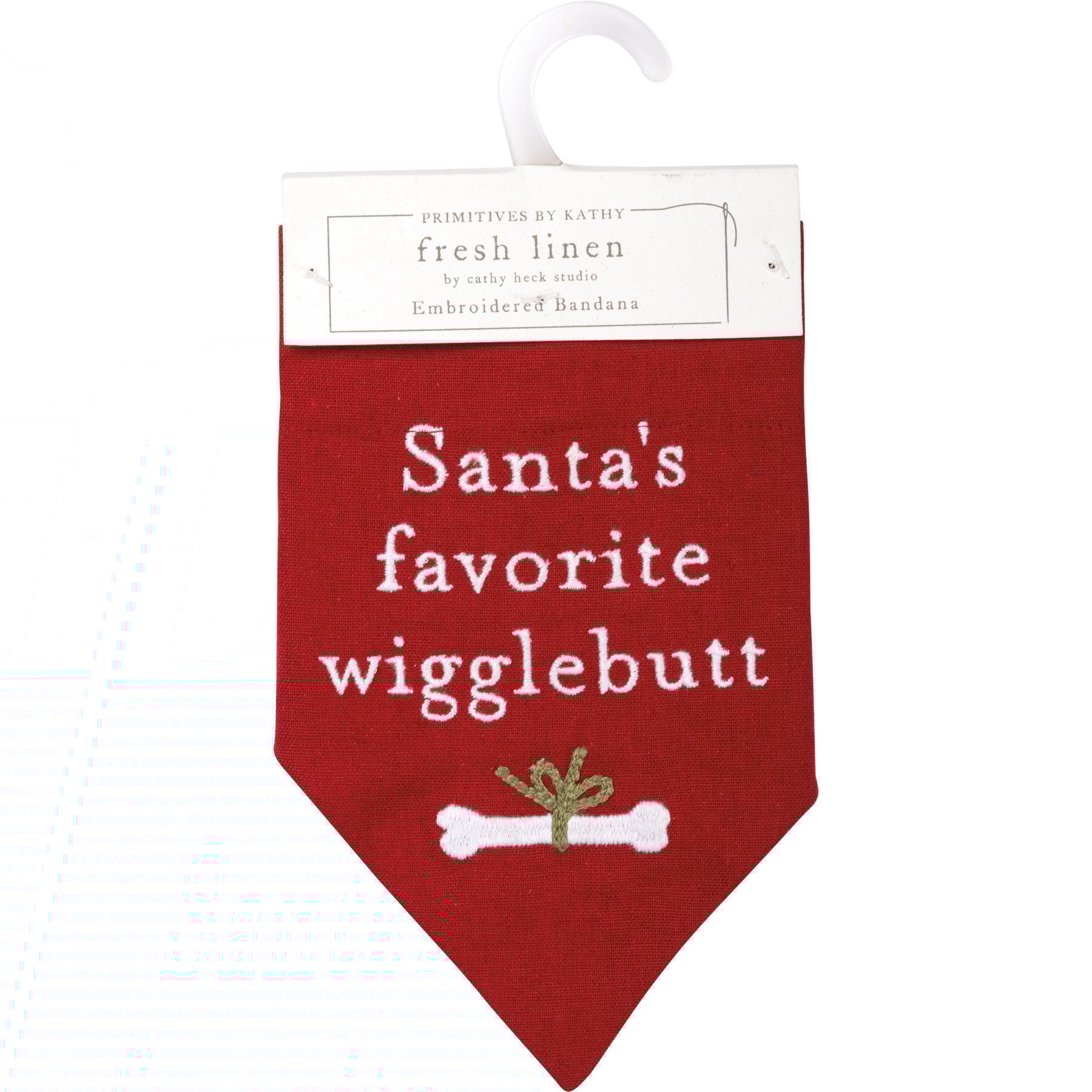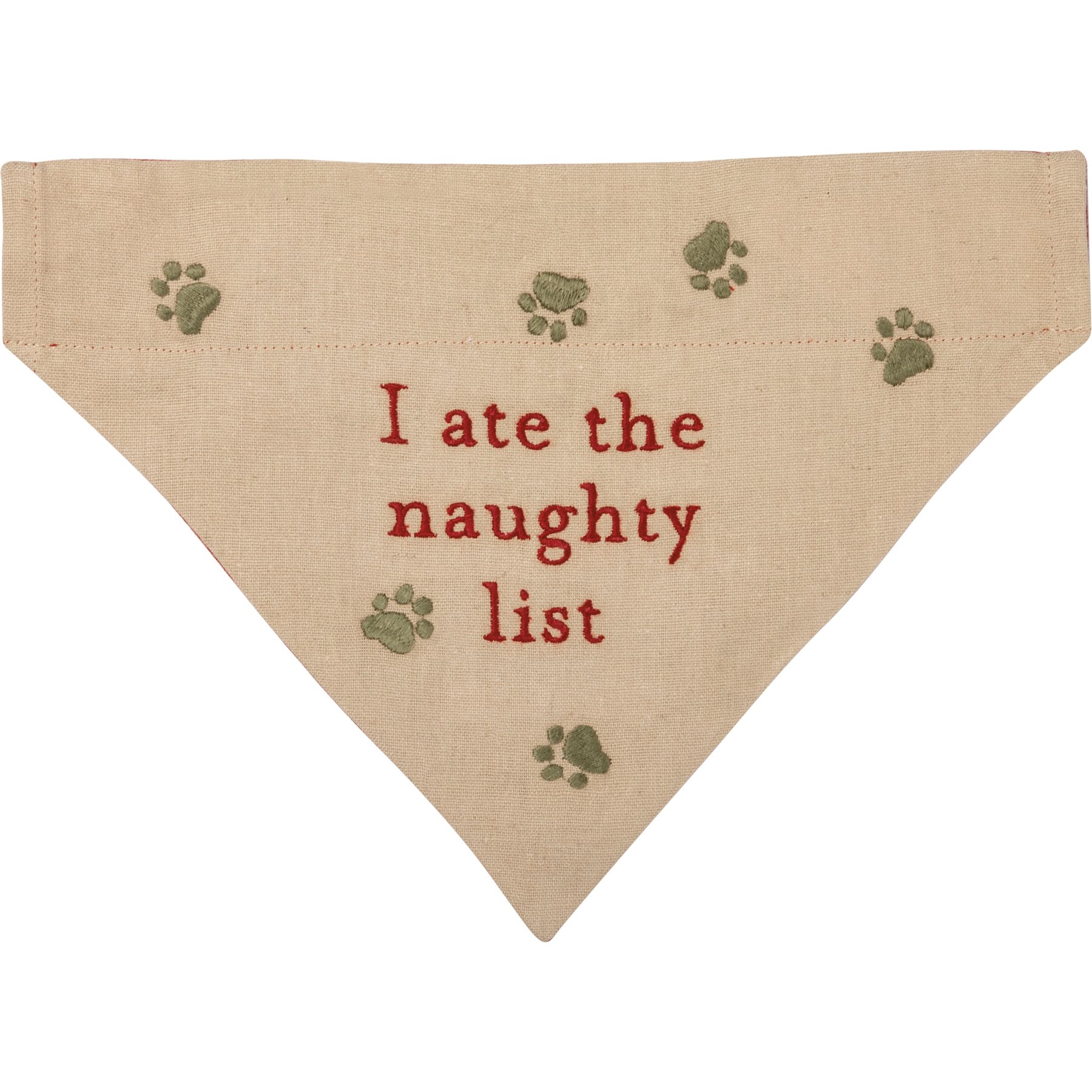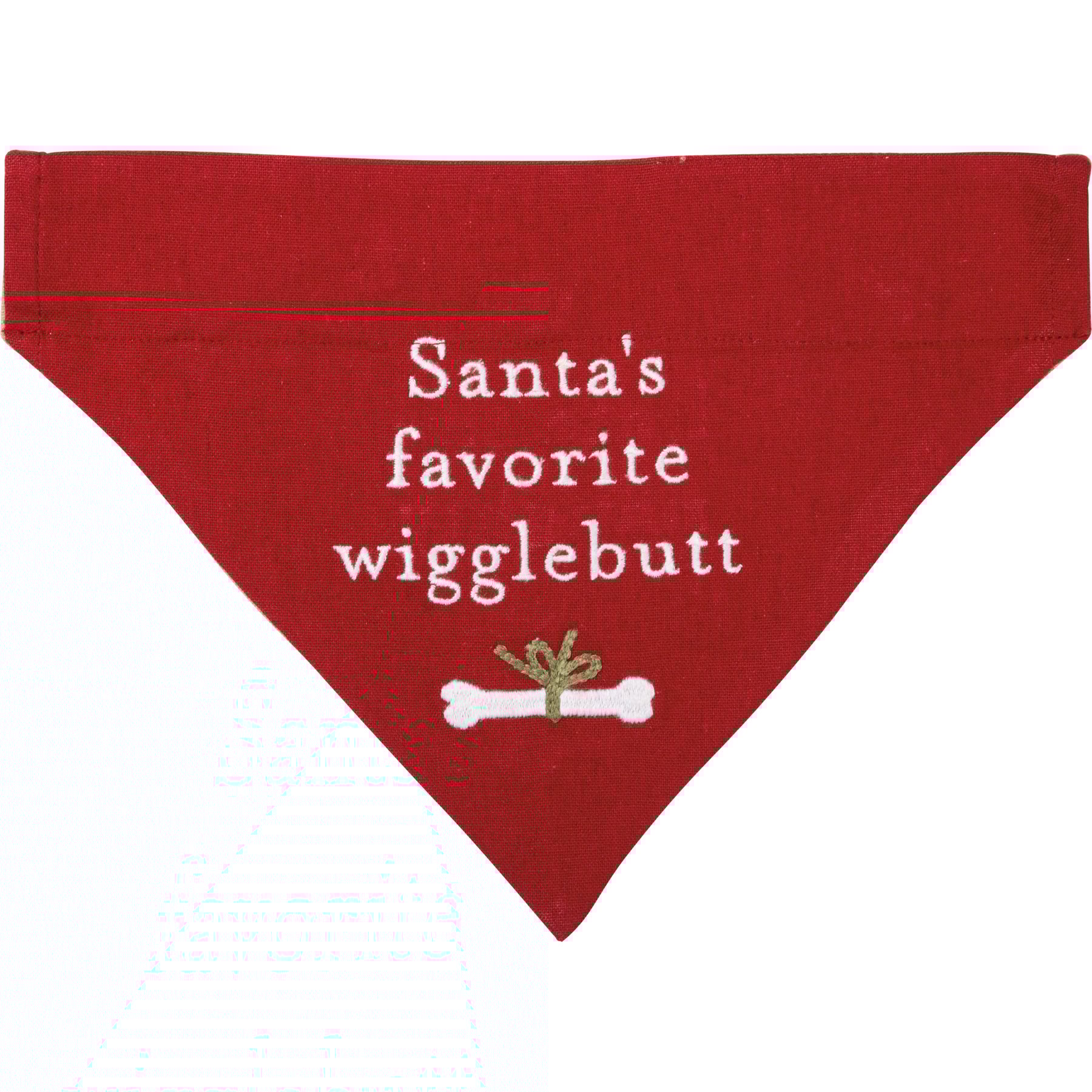 A large reversible cotton linen blend collar bandana. Features an embroidered "Santa's Favorite Wigglebutt" sentiment and dog bone design on one side, and "I Ate The Naughty List" sentiment with paw print designs on the other. Bandana easily slides around standard collars to easily change designs. Machine-washable.