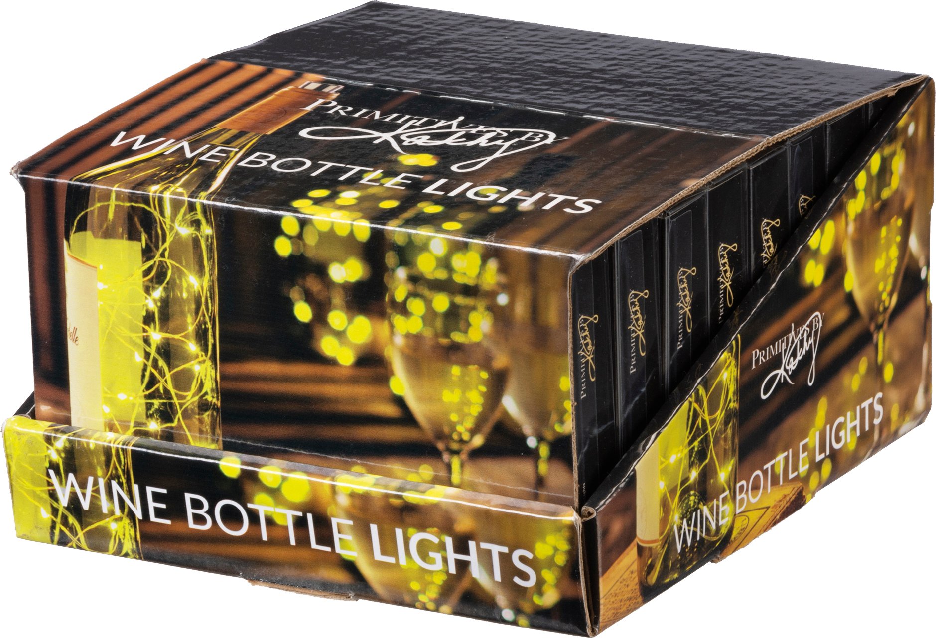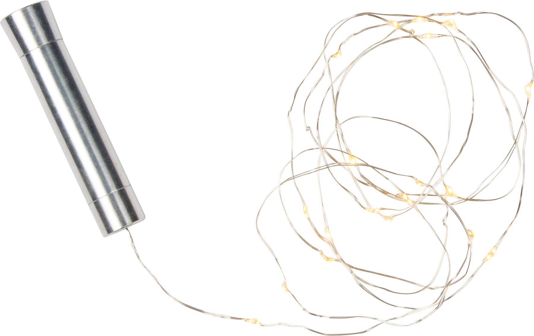 A brushed metal wine stopper from our Lighting Collection with a trail of warm LED lights to illuminate your favorite bottle after you drink it! Our white static wine bottle lights contain a 6-hour timer and require 1 AA battery (not included).