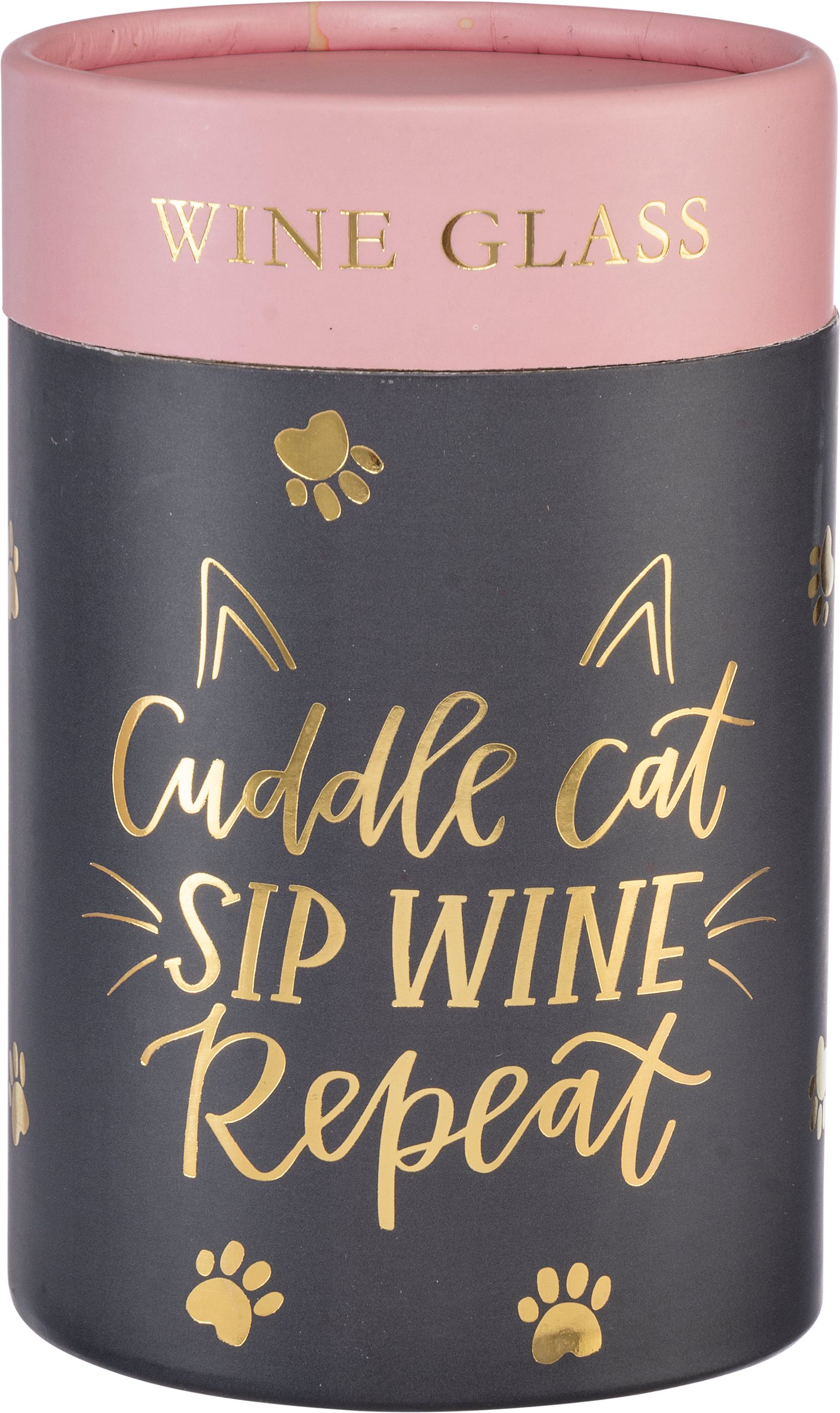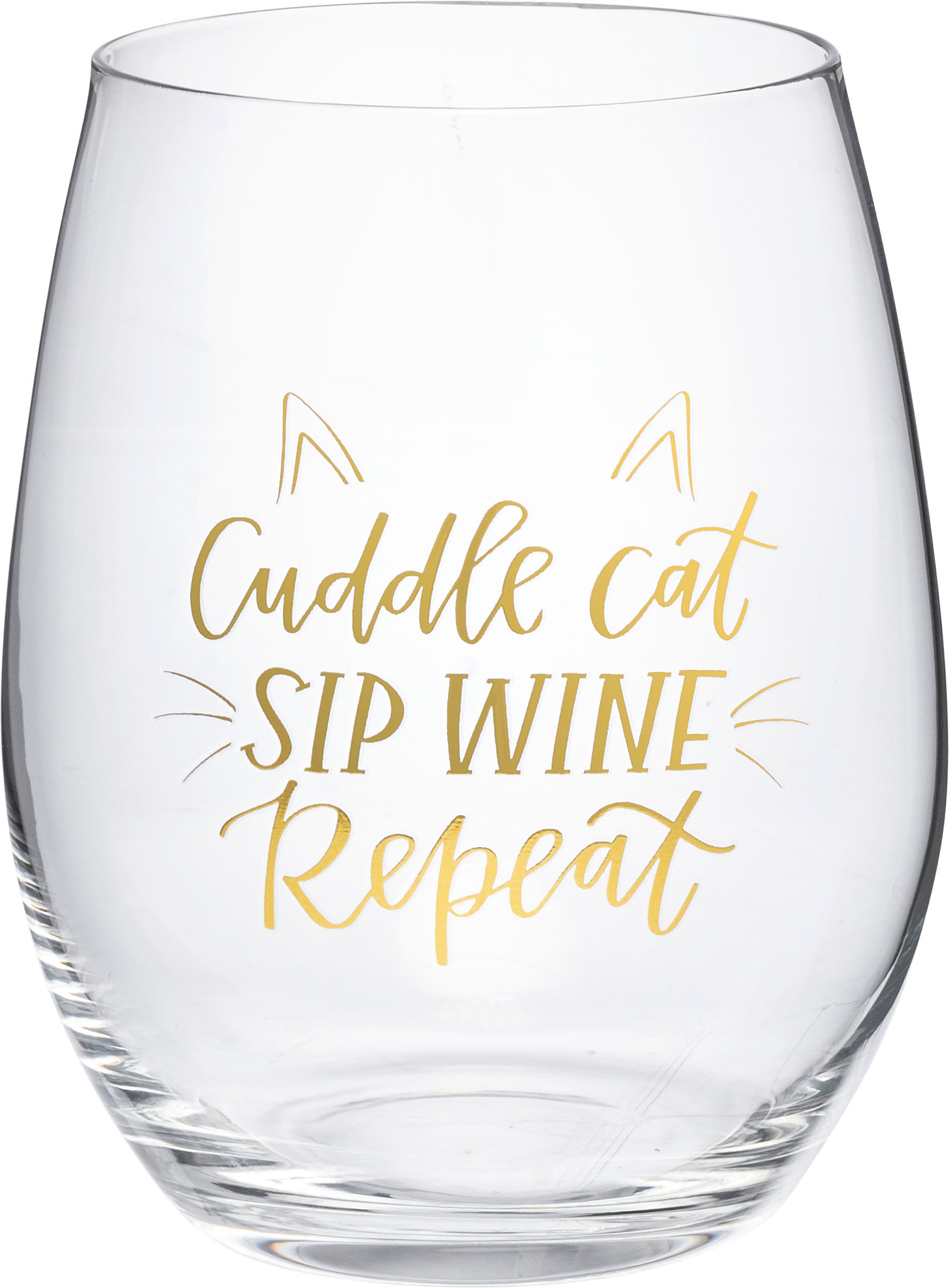A 15 oz stemless wine glass displaying a fun cat inspired sentiment in metallic gold that reads "Cuddle Cat - Sip Wine - Repeat" with coordinating illustrations. Our Cuddle Cat Sip Wine glass comes packaged in a high-quality cylinder box displaying full design. Hand-wash only. A fun pet-themed piece of drinkware that is also great for gifting.