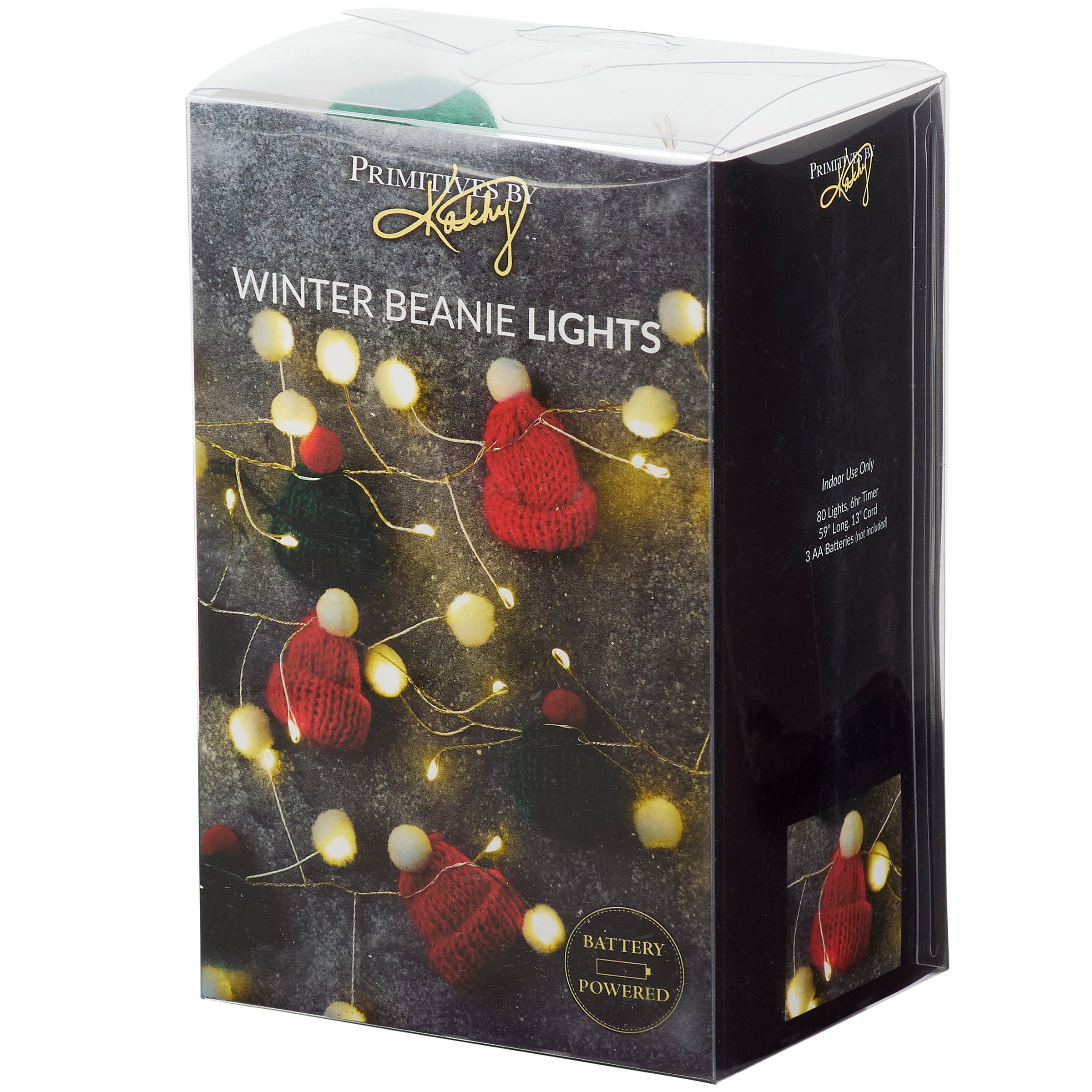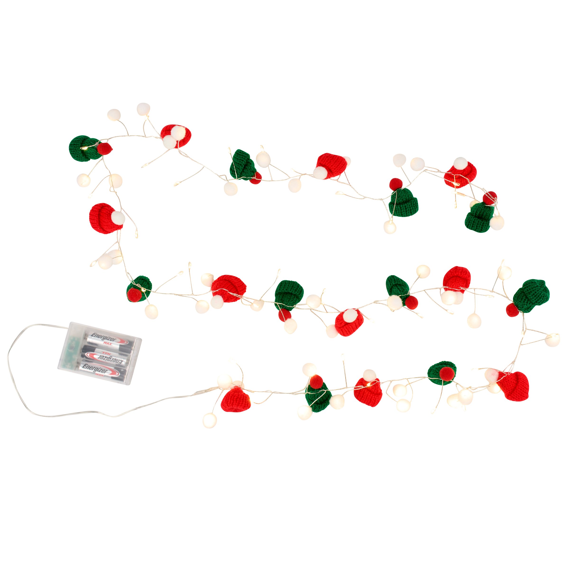 A set of string lights from our Christmas Collection featuring red and green winter beanies in a hand knit style accented with wire lights. This set of Christmas string lights includes 80 lights along a 59 inch wire attached to power source and 13 inch cord. Our Winter Beanies string lights feature a convenient 6 hour timer powered by 3 AA batteries (not included). Indoor use only. Seasonal lights are packaged in an acrylic box with insert displaying working lights and product information. A Christmas home accent perfect for adding seasonal lighting to any room or mini Christmas tree.