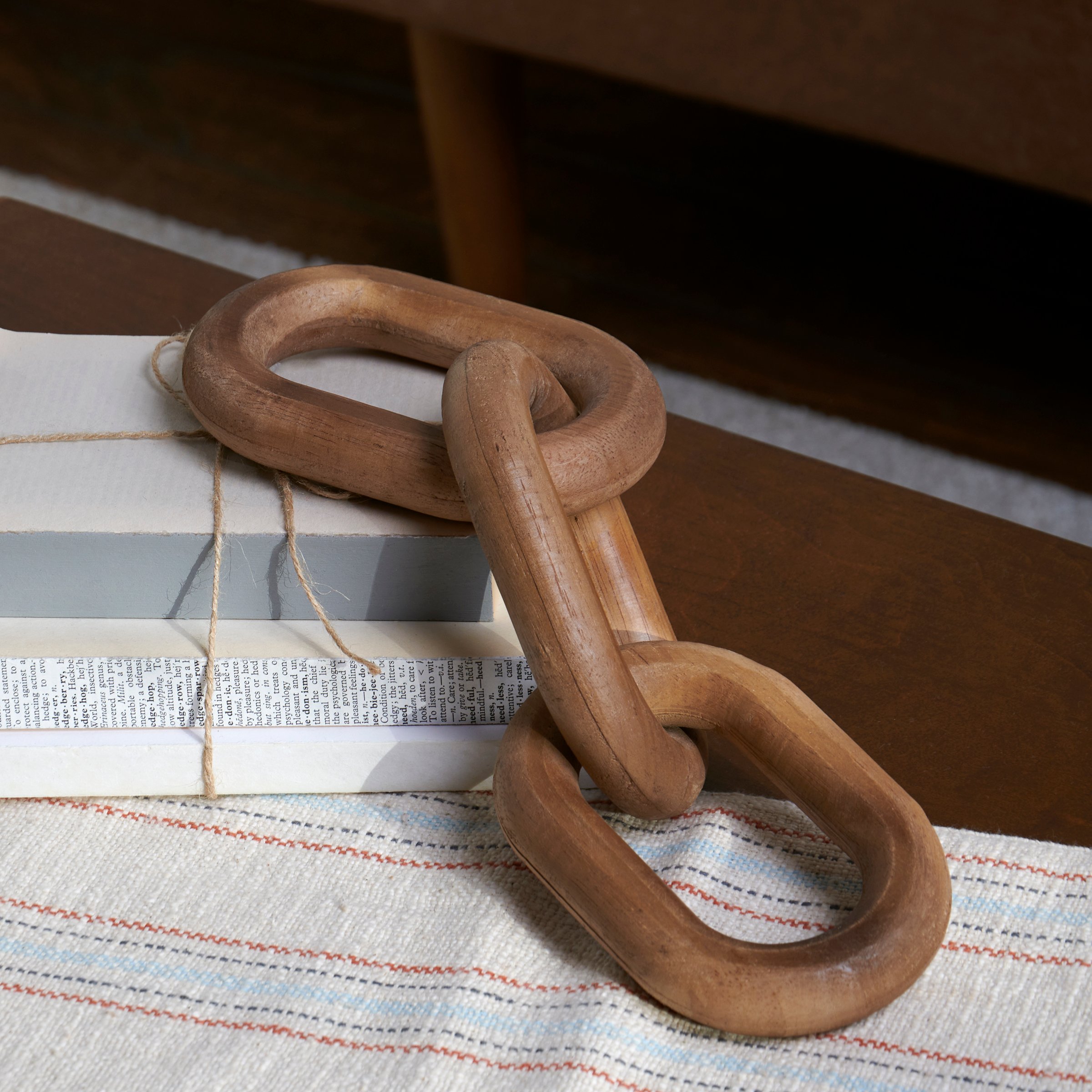 A decorative wood chain from our Home Collection featuring three natural wood links attached to from a short chain. Our wood chain is a rustic home accent with a variety of display options.