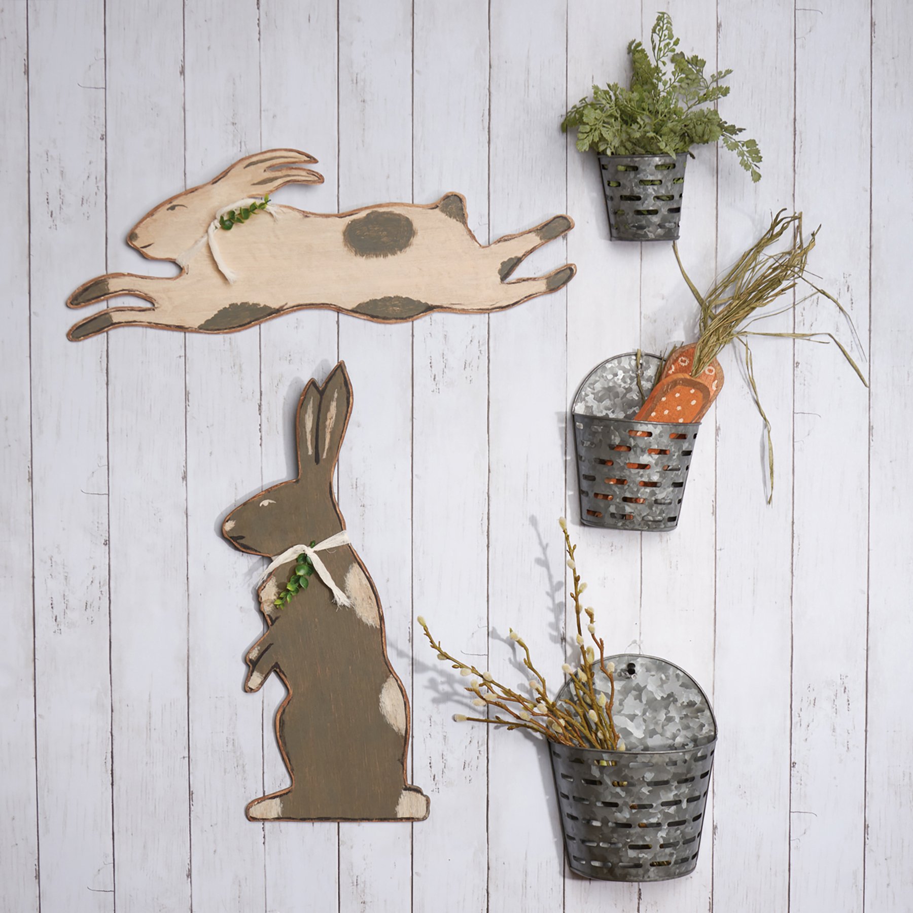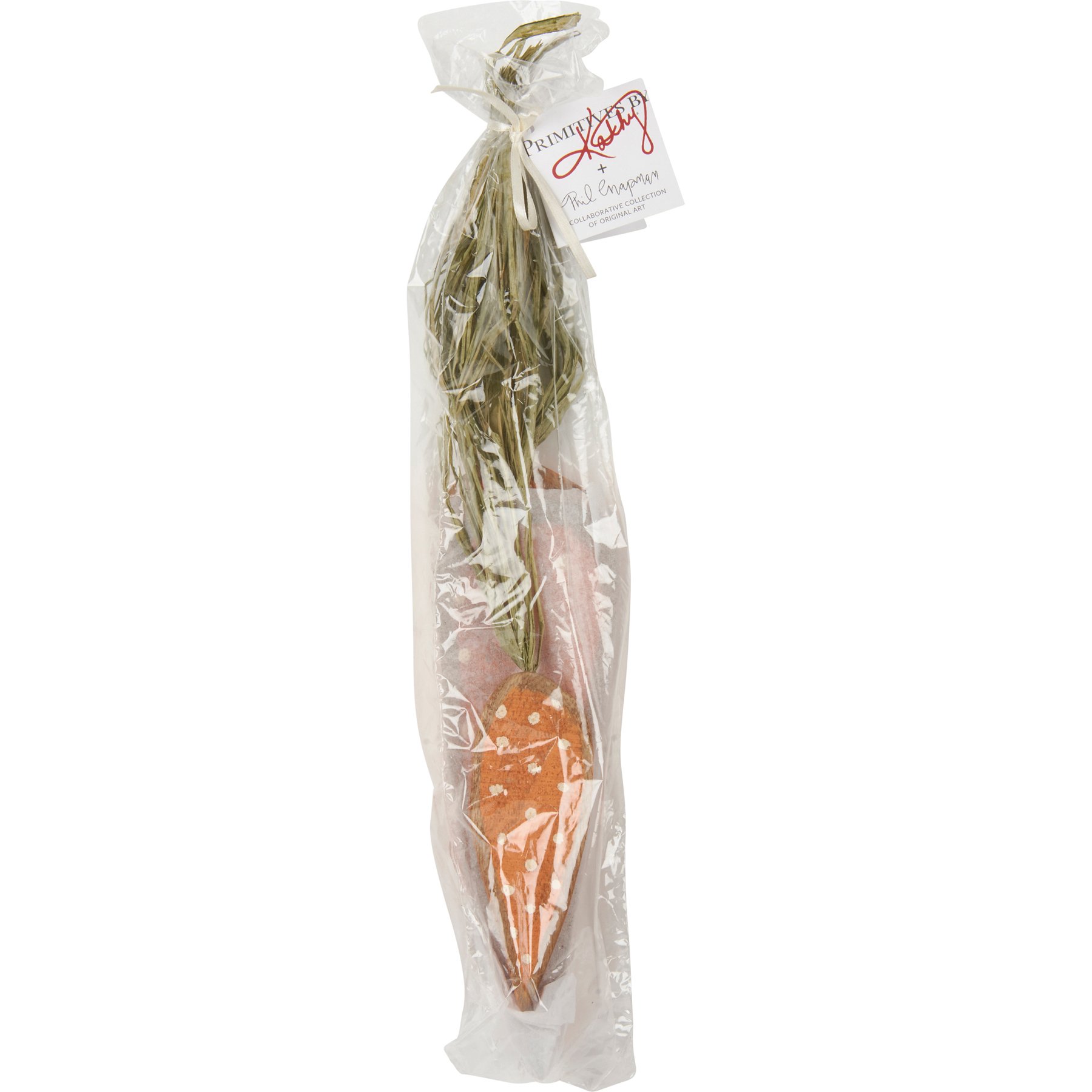 A set of 3 decorative wooden carrots from our Easter & Spring Collection featuring varying sizes with individual dotted patterns and raffia grass as stems. Our Dotted Wooden Carrot set comes packaged in poly bag tied with ribbon and paper between each ornament.