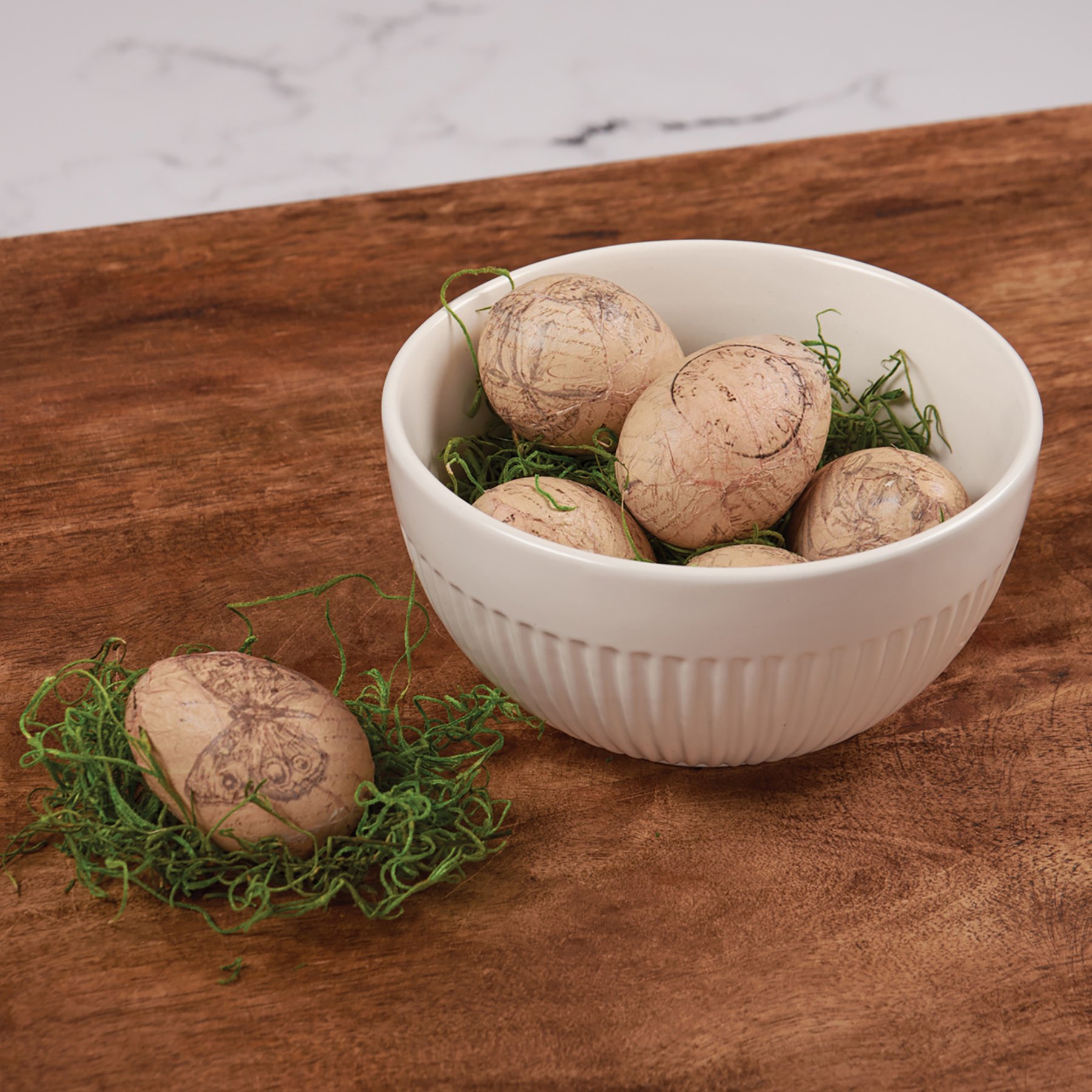 A set of 6 decorative wooden eggs from our Easter & Spring Collection displaying a vintage paper design wrapped around each egg for an antique aesthetic. Vintage paper features designs of butterflies, postal markings, and handwriting. Coordinates well with our French country inspired décor for an elegant display. Our Vintage Paper wooden eggs come packaged in a cardboard box with acrylic lid and cotton tape ribbon around corners.