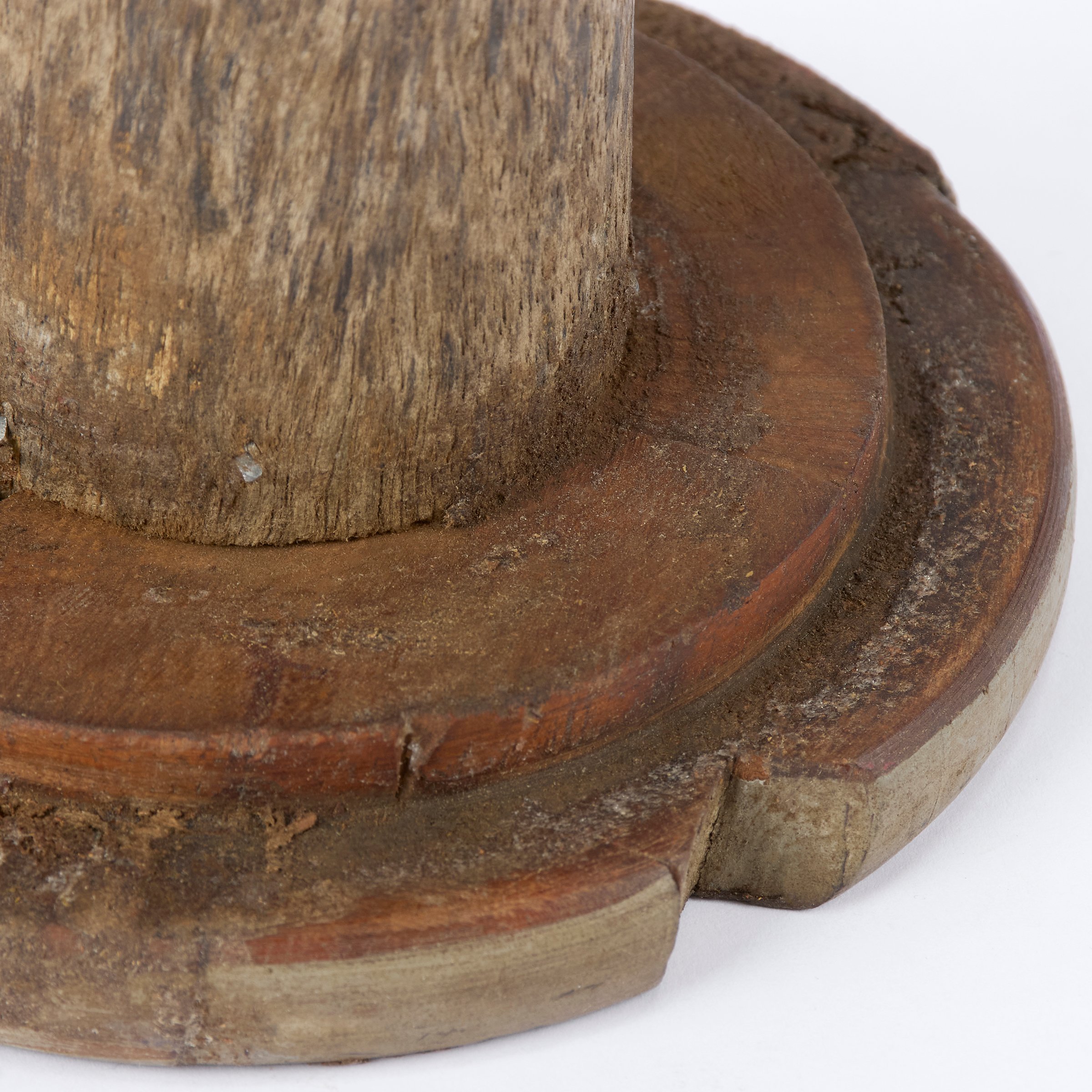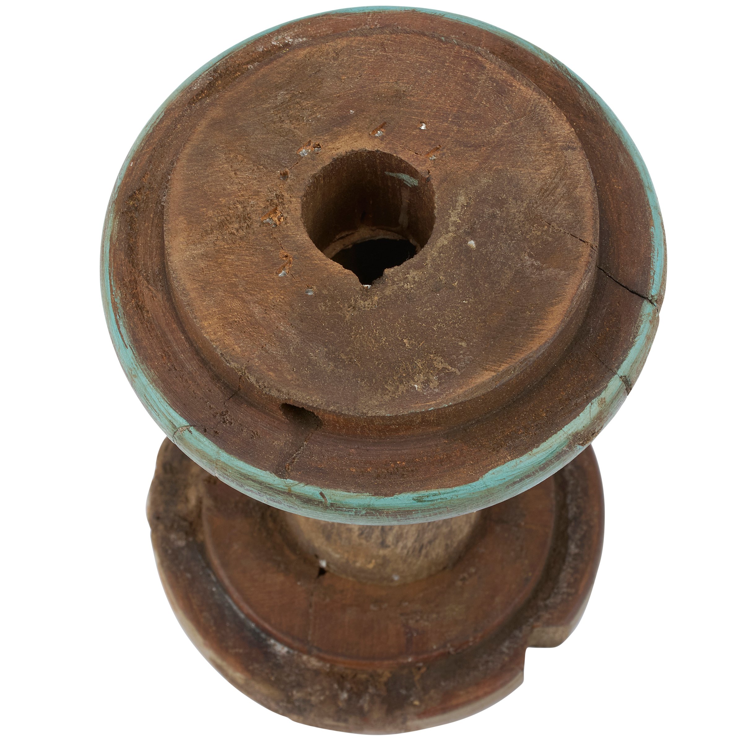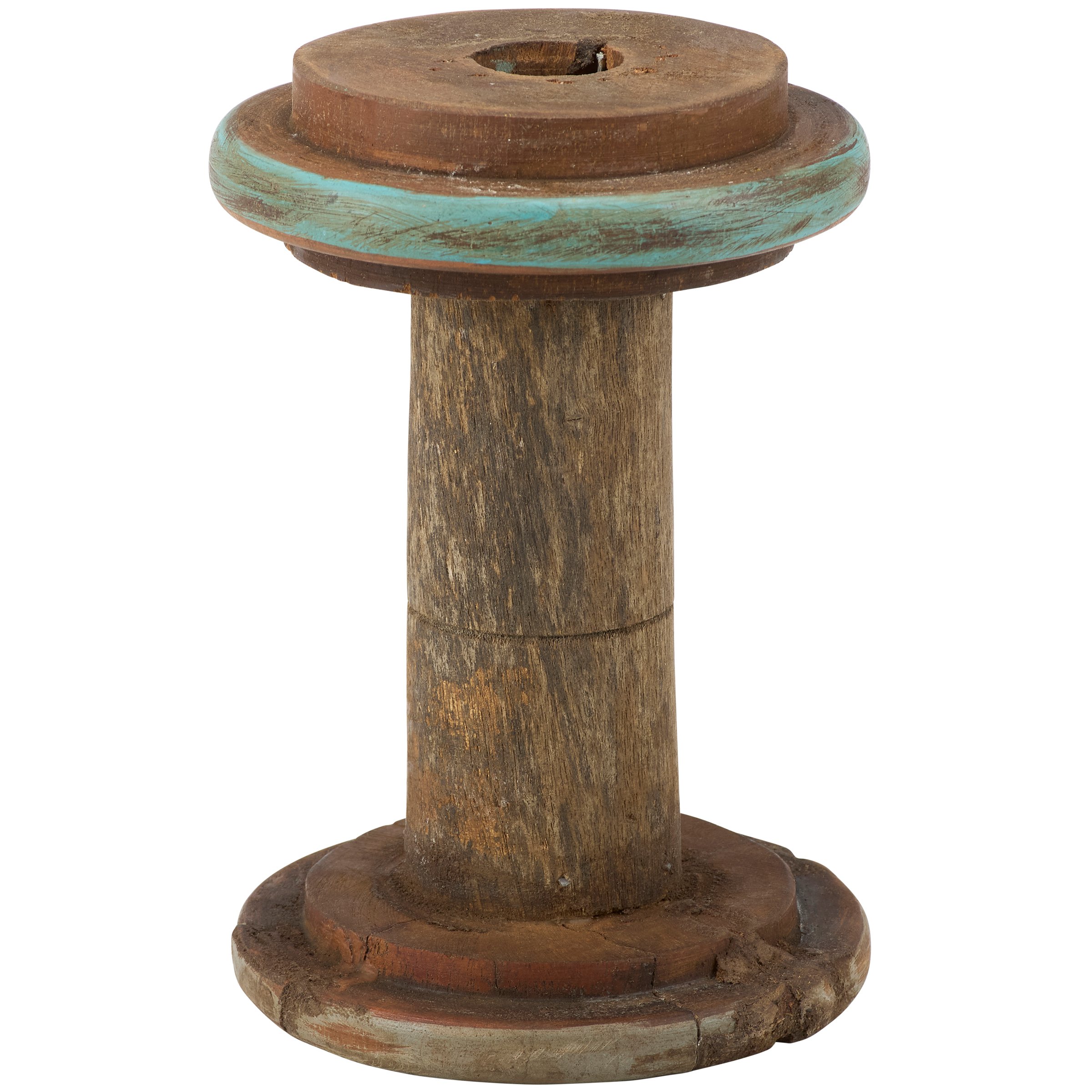 A decorative antique from our Primitive Collection displaying a large wooden spool design made from recycled antique items. Each large antique wooden spool features natural wood with distressed details for an aged appearance. This item is an authentic import from India making each piece unique with varying details like color, pattern, style, and size. Due to the method in which this item is made, we cannot guarantee similar details among multiple items. Our Large Wooden Spool is designed to free-stand on any flat surface for display. A rustic everyday home accent that can easily be added to any home or store display for a uniquely antique style. Displays well on its own but also coordinates with other items from our collection of decorative antiques.