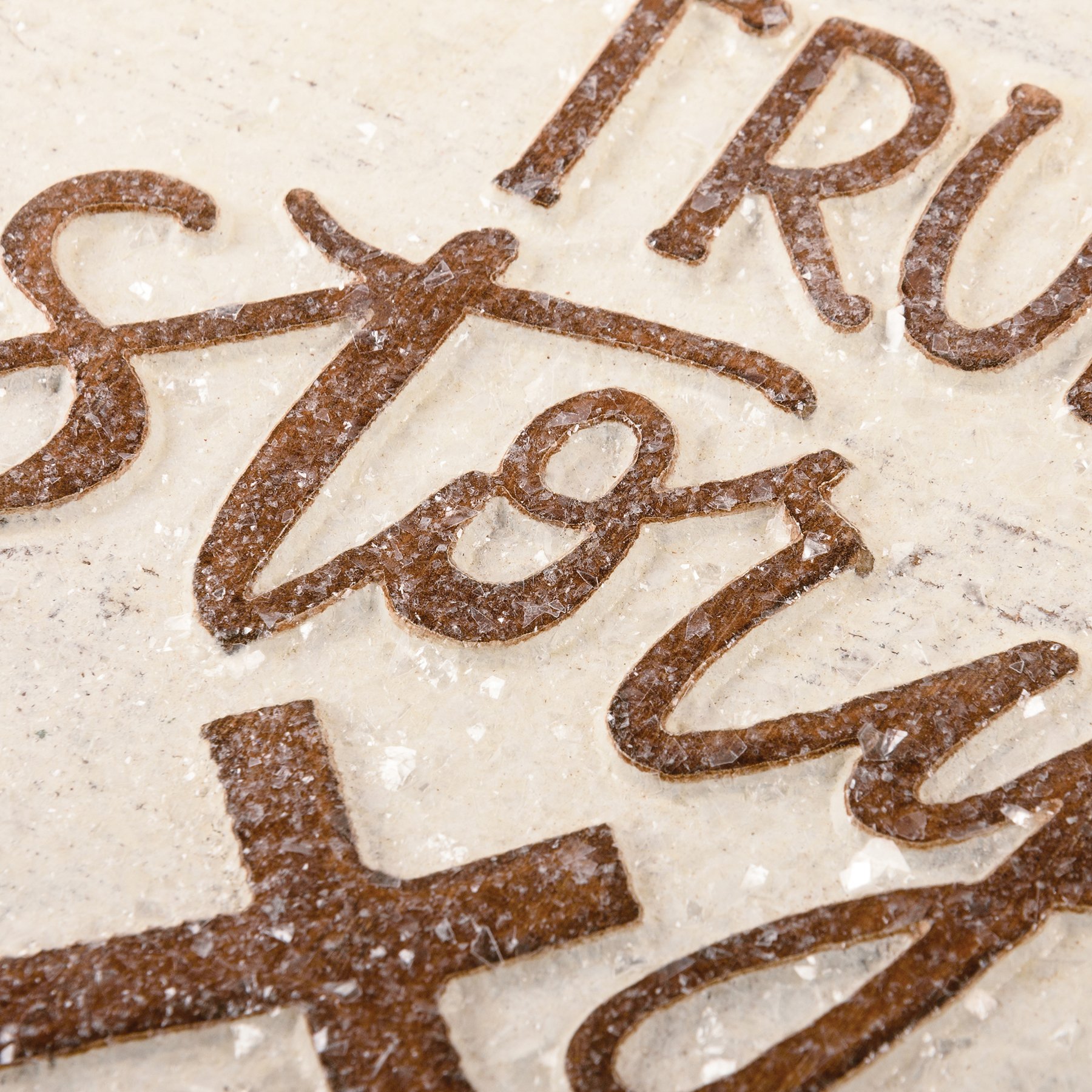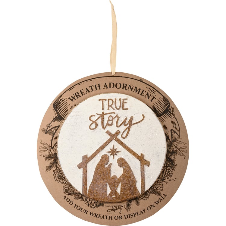 A wooden hanging décor piece featuring an embossed "True Story" sentiment and nativity scene design with an all-over mica coating for a snowy effect. Add a touch of personality to an otherwise plain wreath by simply fastening to wreath via attached wire, or hang alone on a wall or door by saw tooth hanger. Our True Story wreath insert is packaged on a cardstock disk with a cotton tape loop for easy hanging.