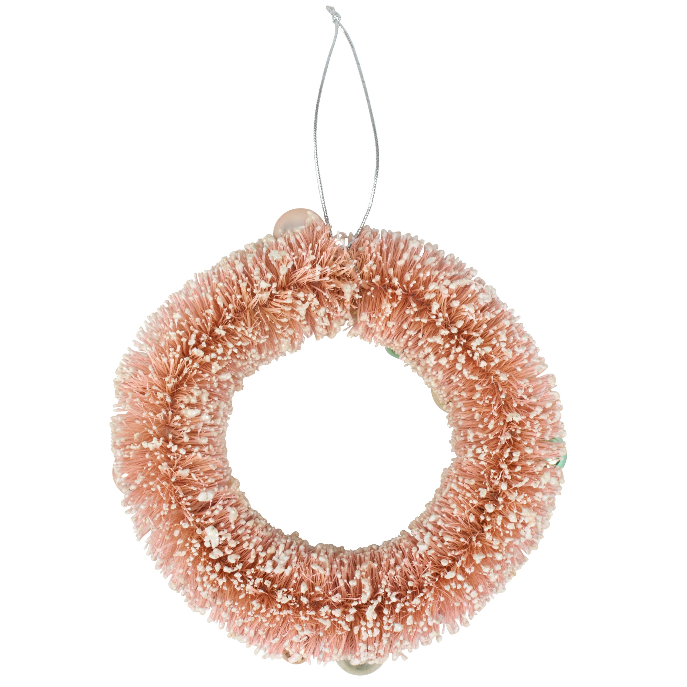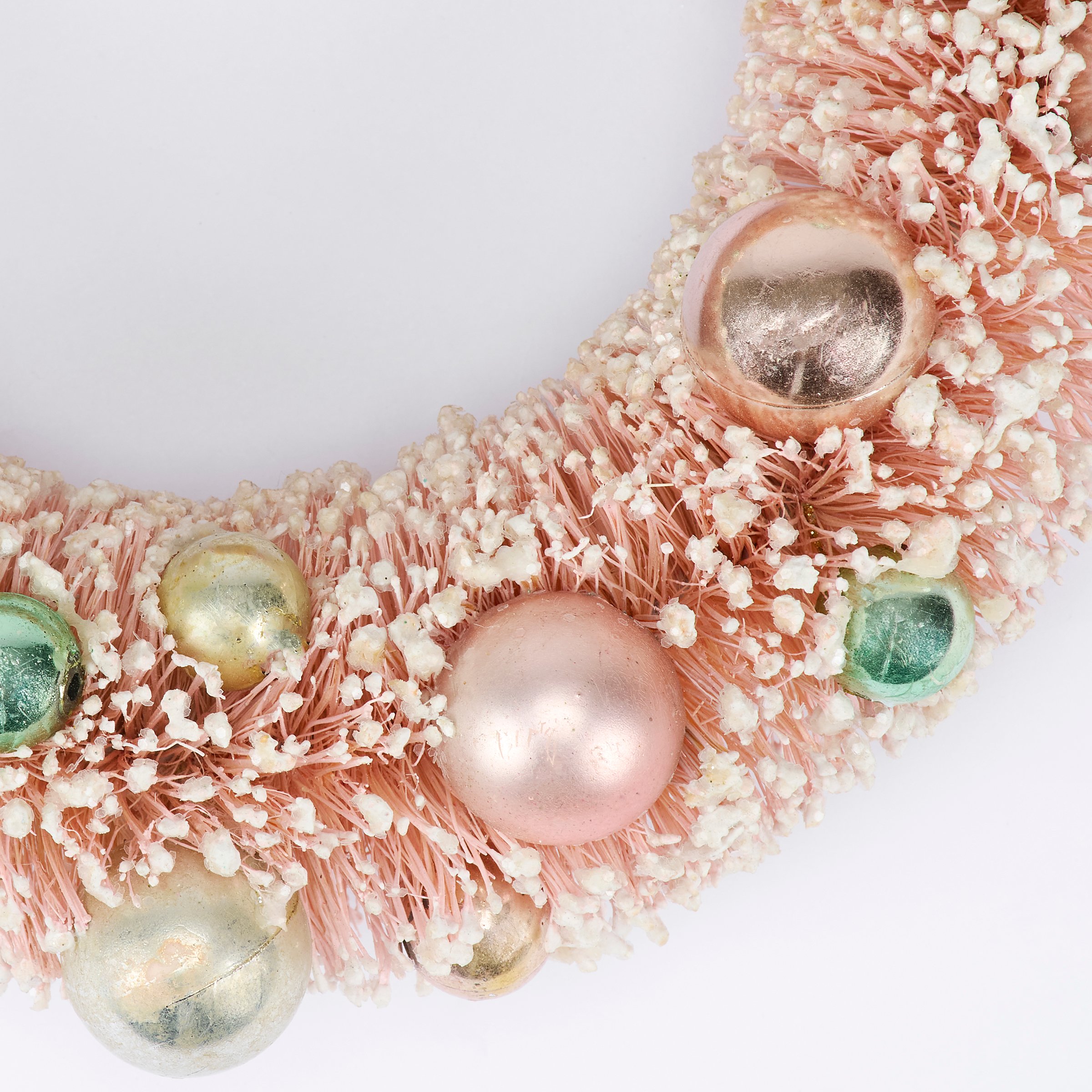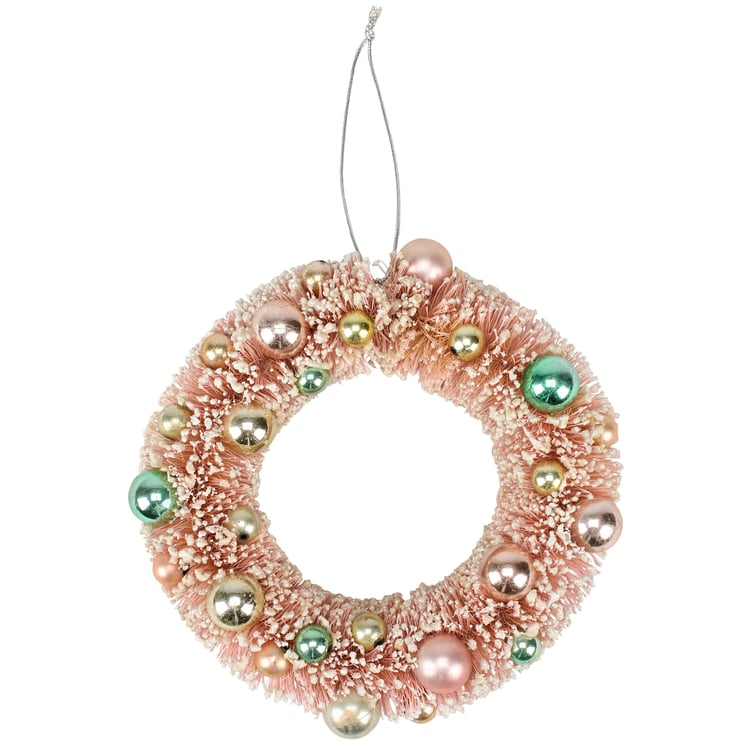 A decorative wreath from our Christmas Collection featuring a bristle design in a retro pastel color palette with coordinating metallic balls and mica detail. Our Pastel Bristle wreath is ready to hang for display via attached string hanger. A retro Christmas home accent perfect for seasonal display.