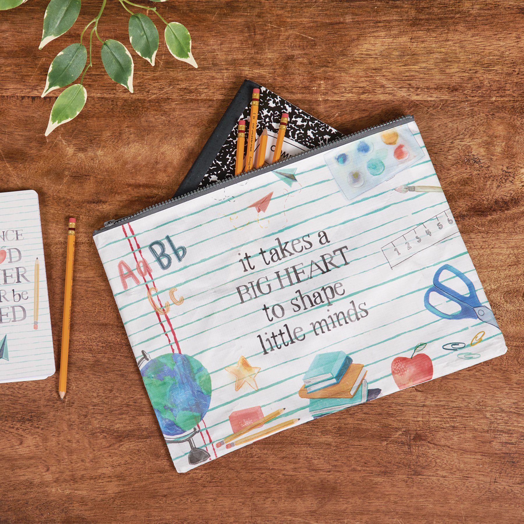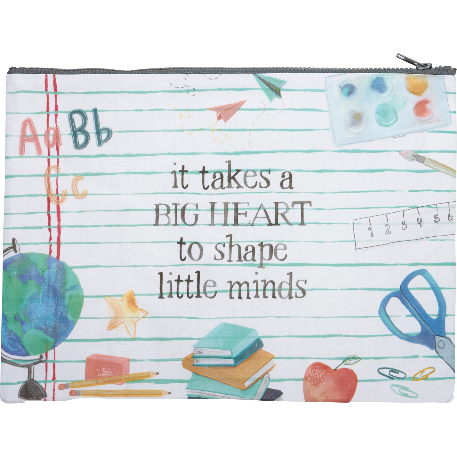 A double-sided zipper folder from our Teacher Collection displaying a charming watercolor design of lined paper and schoolroom objects with hand illustrated sentiment that reads "It Takes A Big Heart To Shape Little Minds." Includes a top zipper closure for easy use. Our It Takes A Big Heart zipper folder is perfectly sized to hold standard paper documents and folders. Made from post-consumer material. California Residents see Prop 65 Notice.