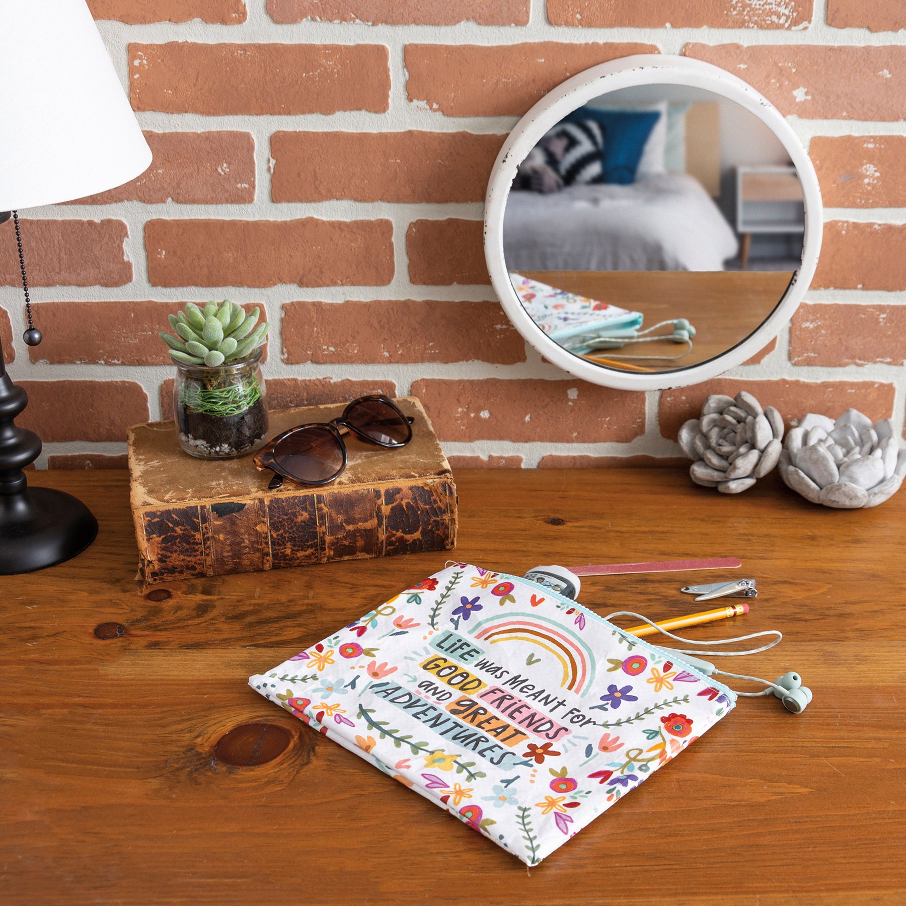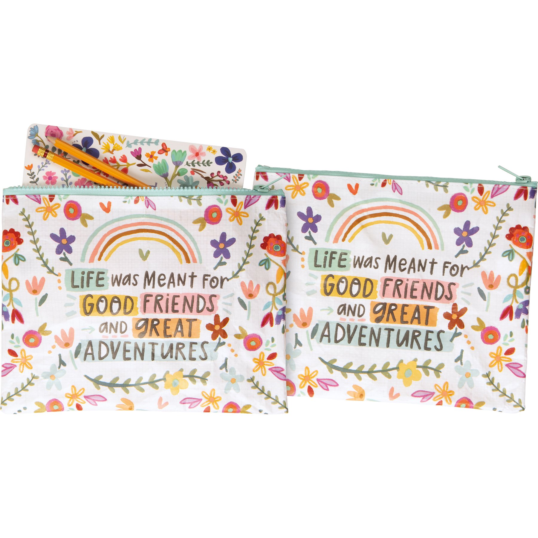 Made of post-consumer material, this double sided zipper wallet features vibrant floral designs with "Life Was Meant For Good Friends And Great Adventures" sentiment. Contains top zip closure.