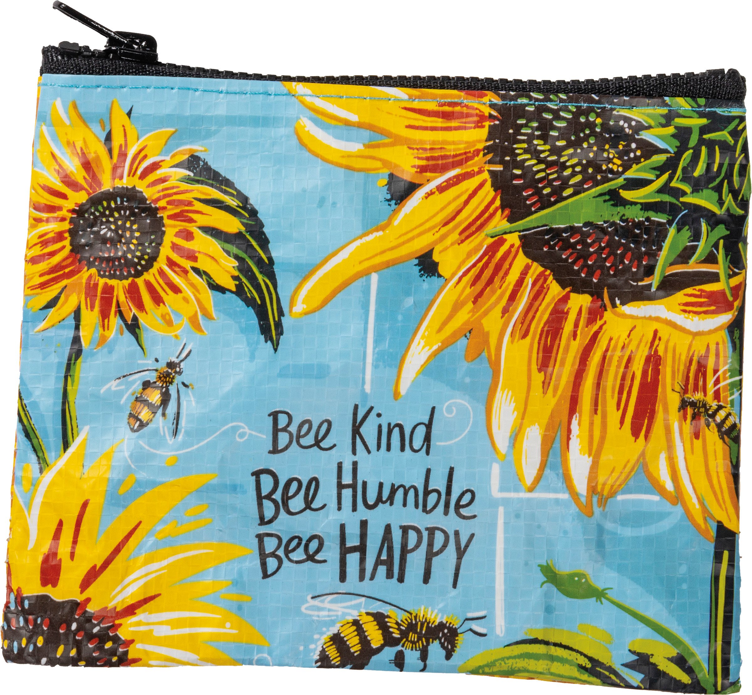 Made of post-consumer material, this double-sided zipper wallet lends a front "Bee Kind Bee Humble Bee Happy" sentiment with peppy sunflower and bee designs, reverse "Kind Humble Happy" sentiment with bee illustration, and a top zip closure. Complements well with other pieces in collection to create a vibrant display!