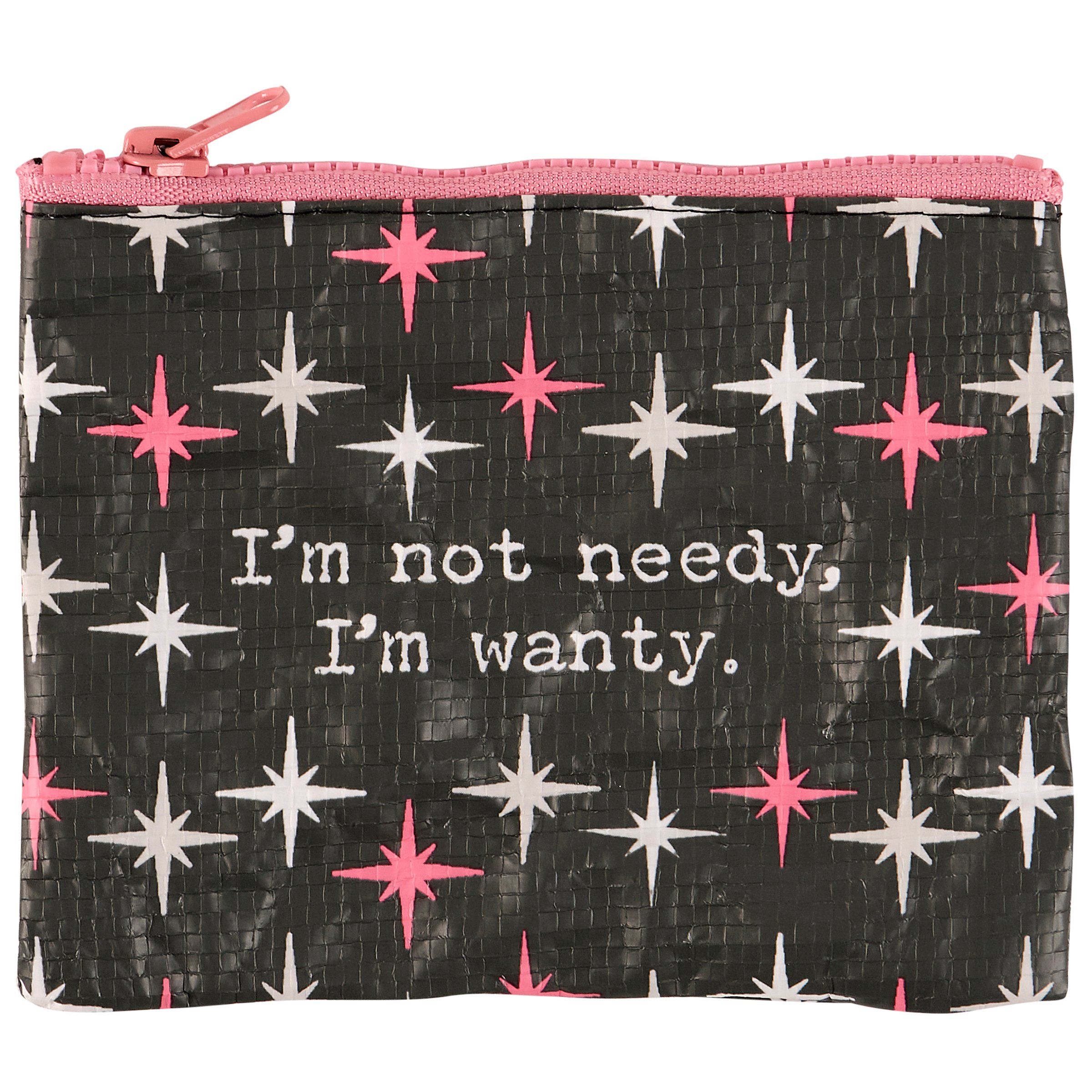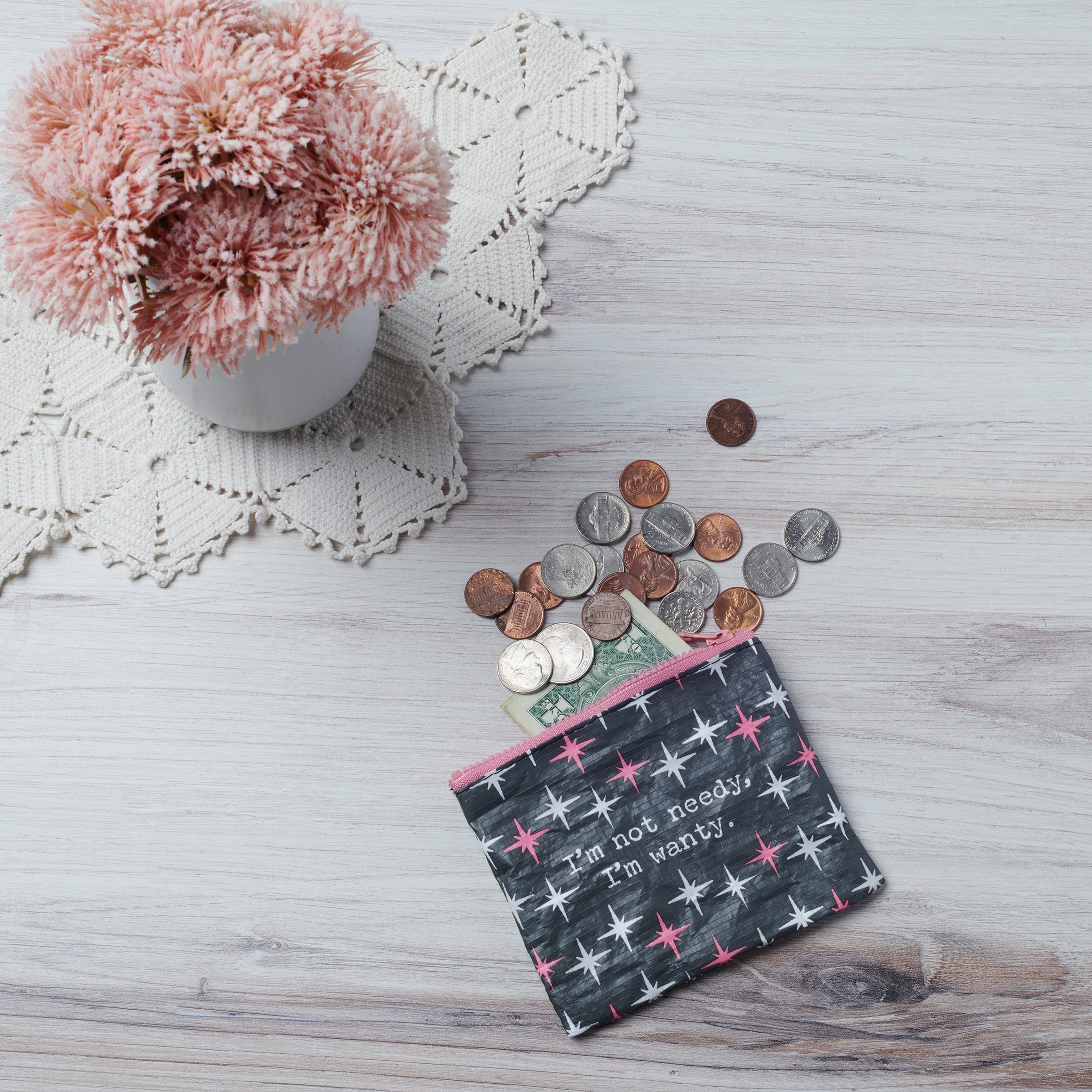 A double-sided zipper wallet from our Trash Talk By Annie Collection flaunting a classy pink and gray retro pattern with a humorous sentiment that reads "I'm Not Needy, I'm Wanty." Funny wallet includes a top zipper closure in coordinating pink color for easily securing items inside. Our I'm Wanty zipper wallet is perfectly sized to hold daily items. Accessories pictured not included. A fun vintage style accessory made from eco-friendly post-consumer material and perfect for stylish organization when on the go.