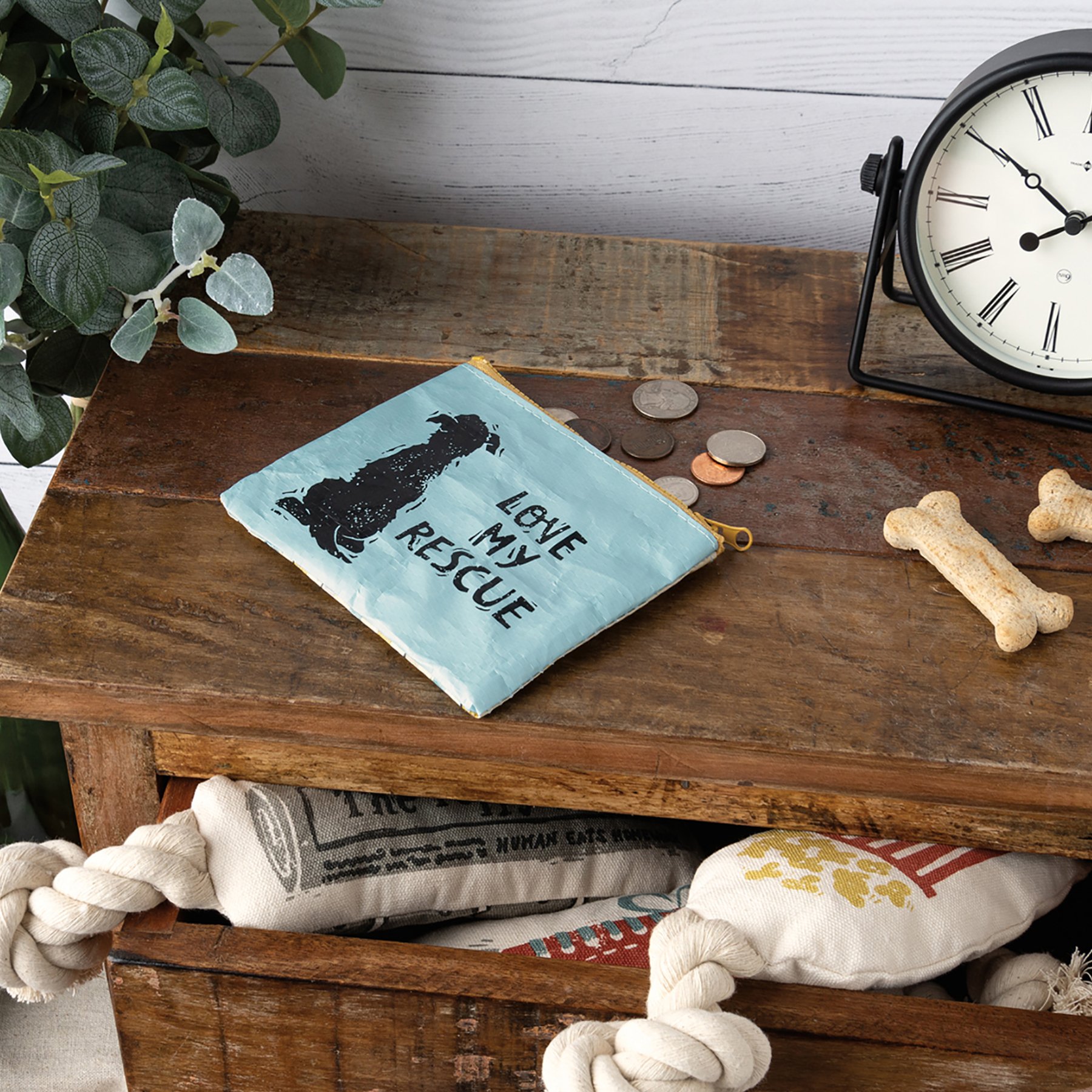 A double-sided zipper wallet from our Pet Collection displaying a cute design of a sitting dog wagging its tail replicated from original block print style art with a heartwarming pet inspired sentiment that reads "Love My Rescue." Colorful design features coordinating stripe pattern on the back. Rescue dog wallet includes a top zipper closure in coordinating yellow color for easily securing items inside. Our Love My Rescue zipper wallet is made from eco-friendly post-consumer material and is perfectly sized to hold daily on the go items. Accessories pictured not included. A lovely pet-themed everyday accessory perfect for on the go organization.